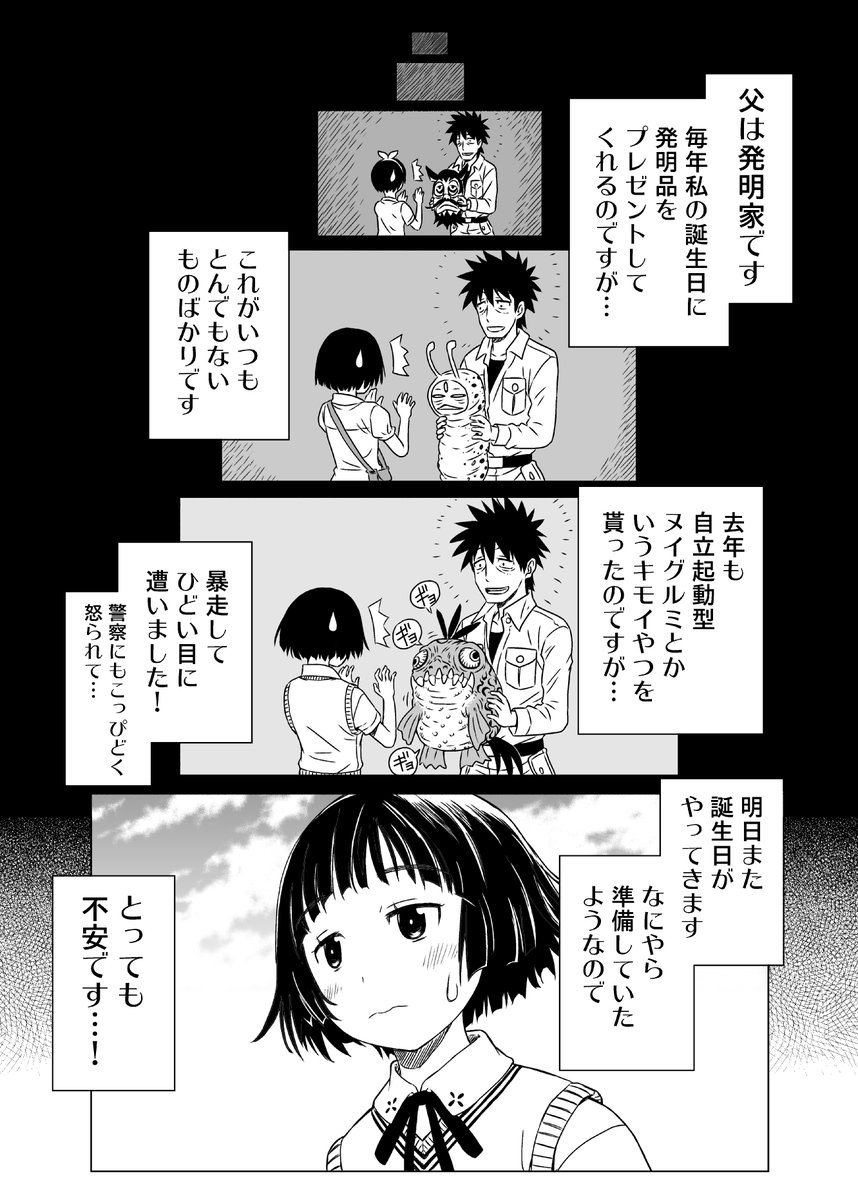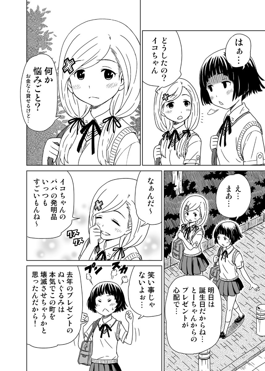 1 2 かなり前に描いていて、途中で頓挫してしまった漫画です。 途中で終わるのですが、ご興味がある方は見ていただければ…。 着ぐるみを着ると強くなる女の子のお話。(1/4) #エアコミティア 21/11/21 13:47