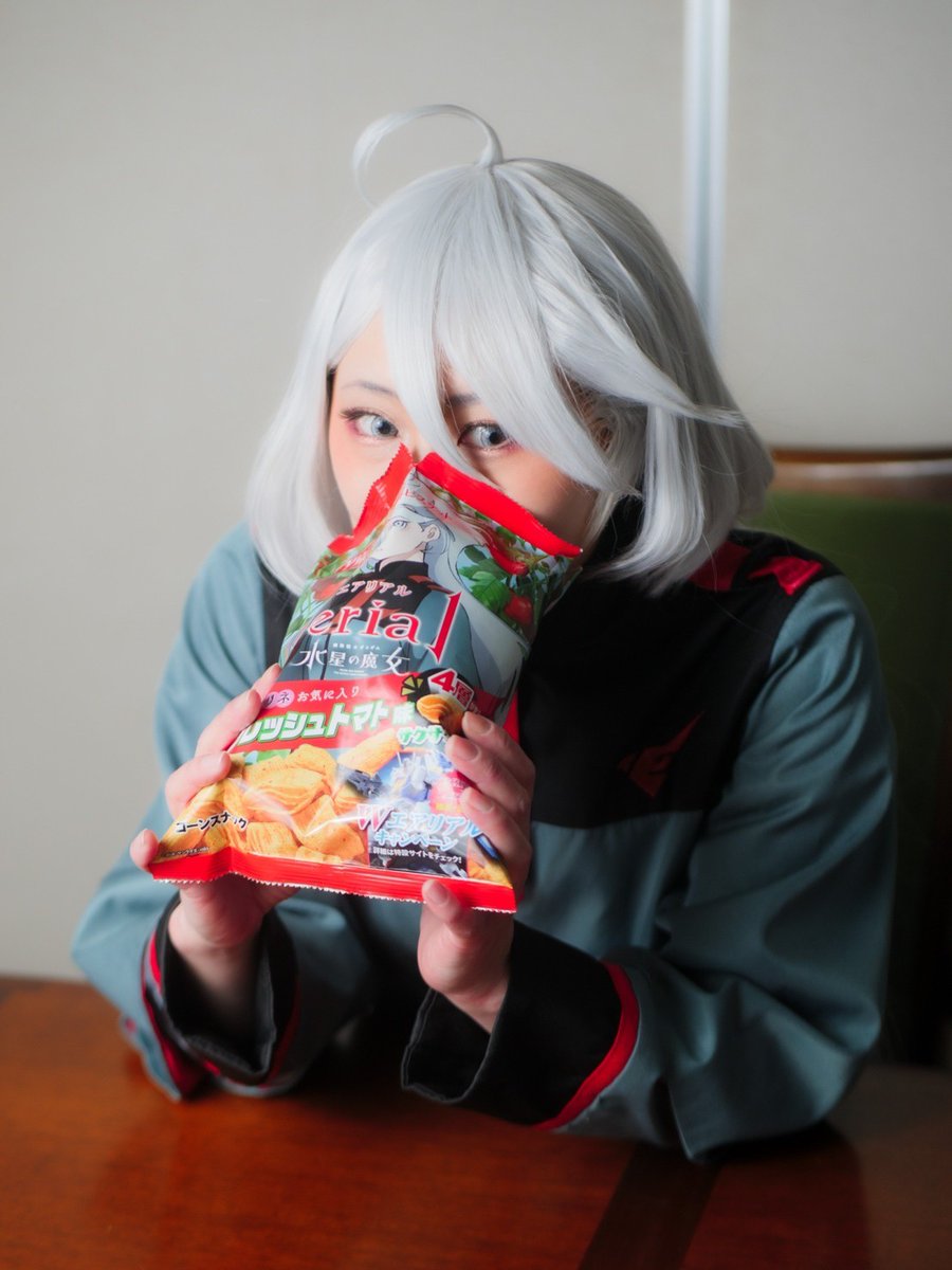#コスプレ ひしゃたい:ぁにゃこさん @yume1224yume きゃら:ミオリネ・レンブラン(機動戦士ガンダム水星の魔女) オフショットなんだけど、この日のためにもう店頭にはあんまり置いてなかった頃のトマトエアリアルを確保したワイ偉くないですか!!??