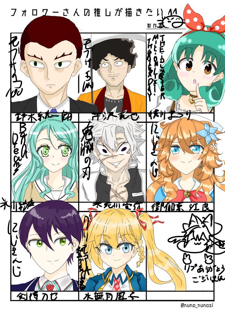 #フォロワーさんの推しが描きたい 全員完成したデース!!!!全員知ってるキャラだったし、とにかく描くの楽しかったァー!!!!リプくださった皆さん!ありがとうございましたー!!!(文字無しは下に。