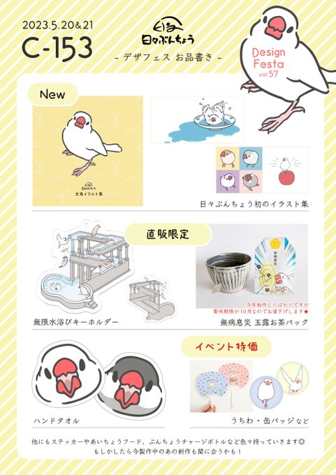 #デザフェス57 に出展します✨ 初の文鳥イラスト集もここでお披露目^(•ө•)^!! 西館1F ブースNo. C-153 5月20・21日両日参戦! #デザフェスお品書き #デザフェス