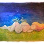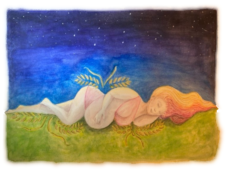 end of #inktober2022 (finally!) day 29 'uh-oh', day 30 'gear', day 31 'farm' (goddess demeter of harvest, growing a baby, with virgo constellation over head)