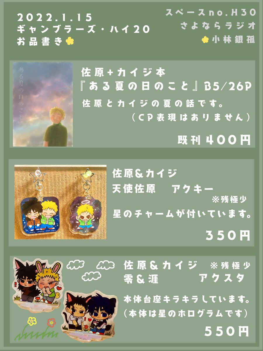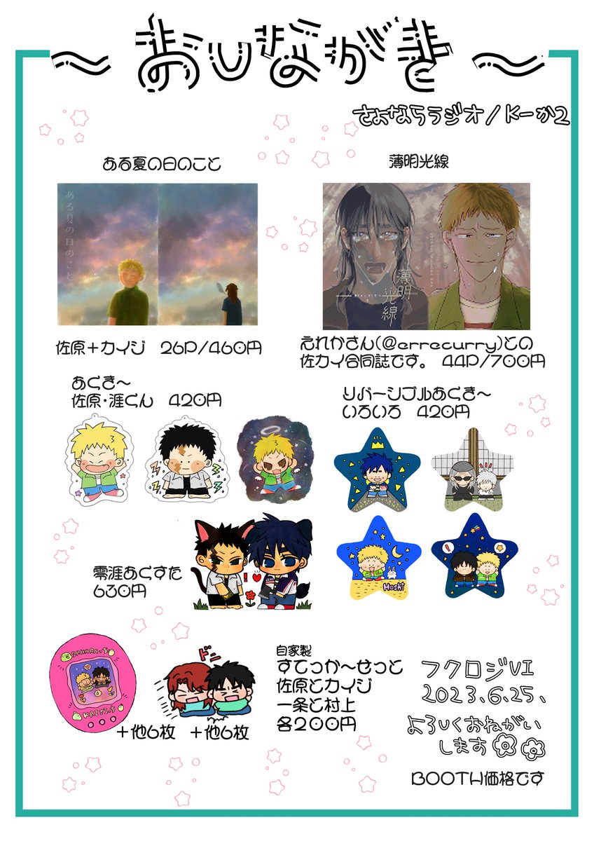 2/13ポックエ5お品書き出来ました! 当日は【エリアA:う2 さよならラジオ】にてお待ちしております🌼 よろしくお願い致します⭐️ (画質があまり良くないので見やすい画像はツリーのツイート参照でお願いします🙇♂️) #ポックエ5 #ポックエ5新作 #ポックエ5お品書き