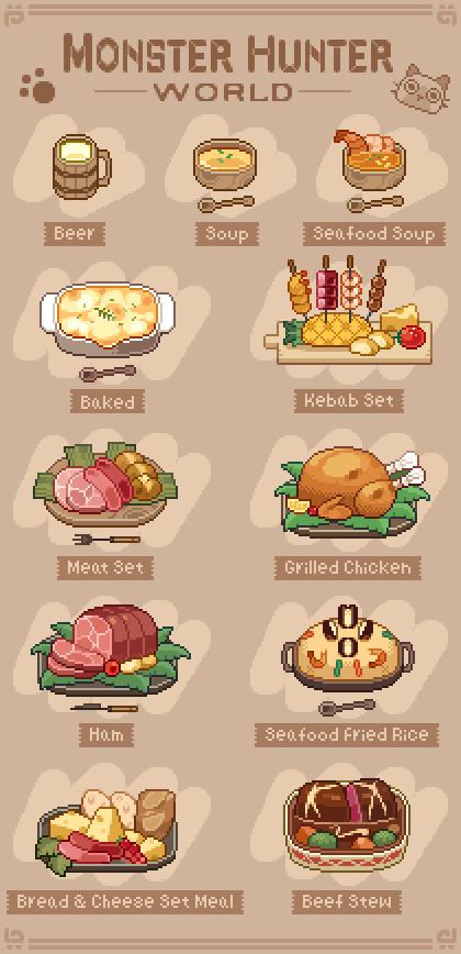 【Pixelart|Monster Hunter World】 🍖🍗🥩A variety of delicious meat dishes #MonsterHunter #pixelart #ドット絵