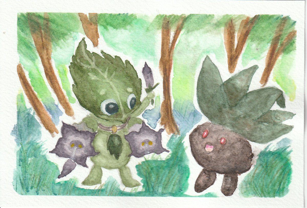 森羅の水先 リーフとナゾノリーフ。 (外部から失礼します) #リンクスお絵描き部 #水彩画練習中 #森羅の水先リーフ #ナゾノクサ