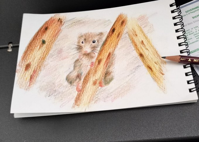 2 7 出張の合間の落書き3枚 ダイソーの色鉛筆は折れやすくて描きにくかった…😢 #色鉛筆画 #カヤネズミ #エゾヤチネズミ #ネザーランドドワーフ 23/05/14 03:15
