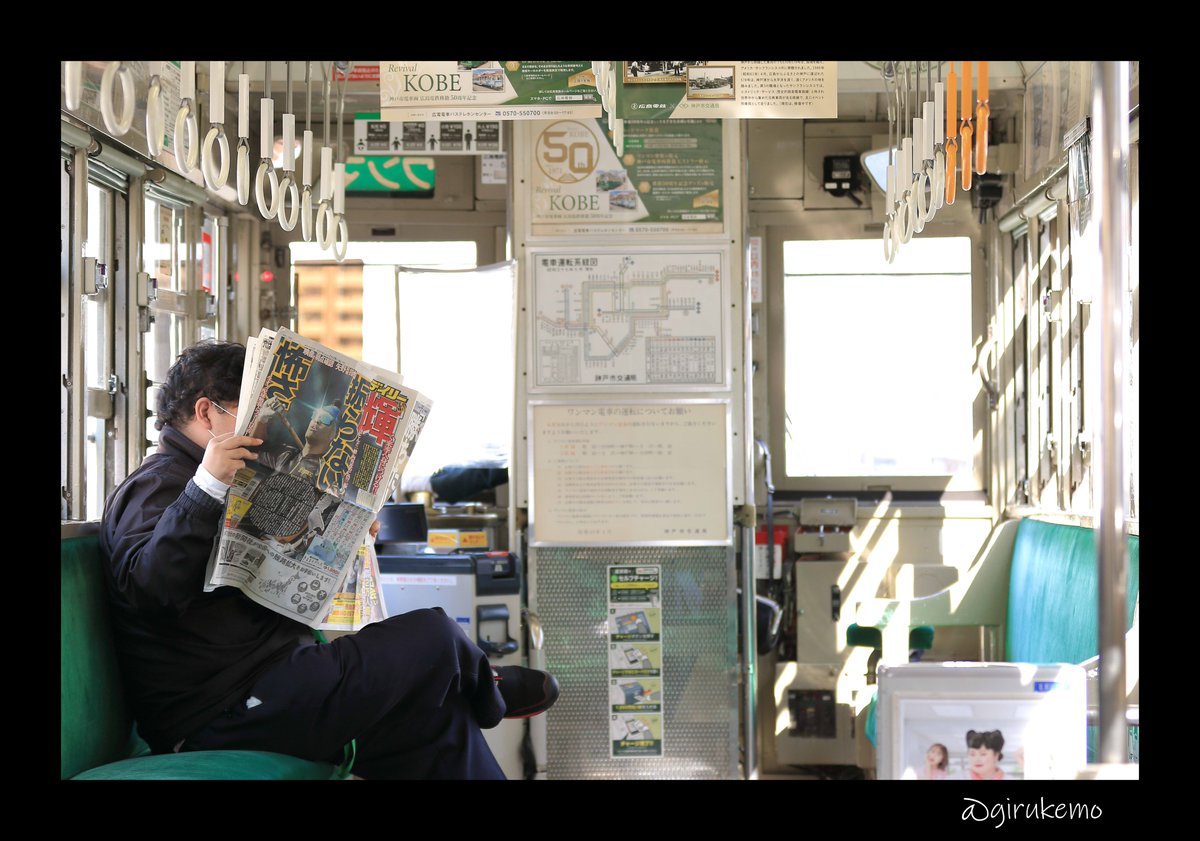 先日、広電の貸切に参加させていただきました 582号の車内でデイリースポーツを読む神戸のおっちゃん、実に神戸っぽい… (本人に掲載許可済み)