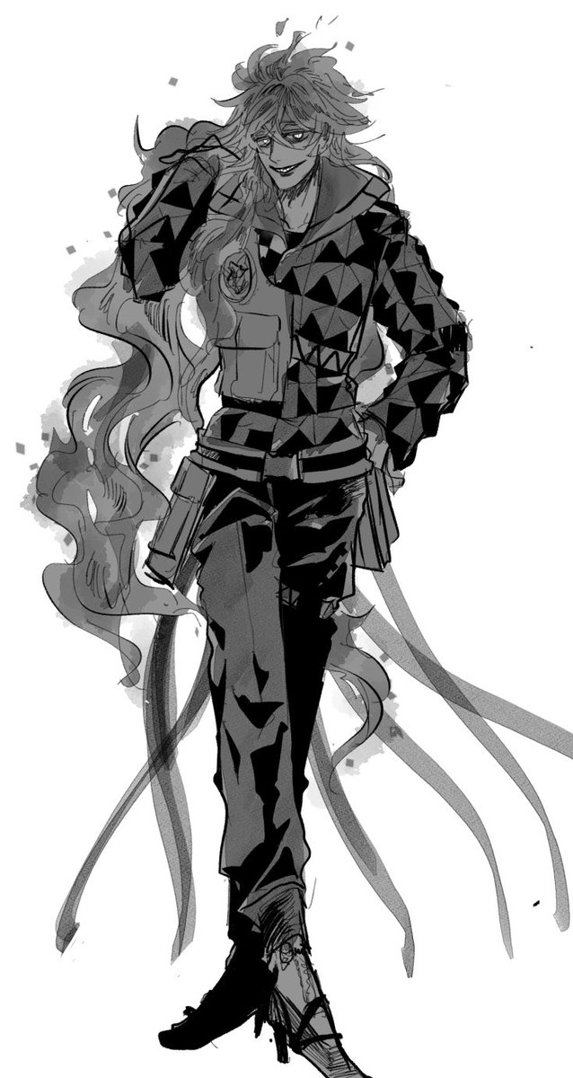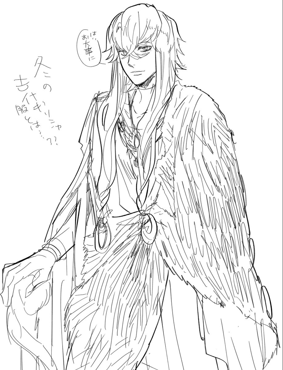 ありもので殴り書きしたがすごい、こう羽に包まれているかのようなデザインなのにパンツスタイルで胸筋があるのすごいすき いや好きなとこ全然かけてないがとにかく好き