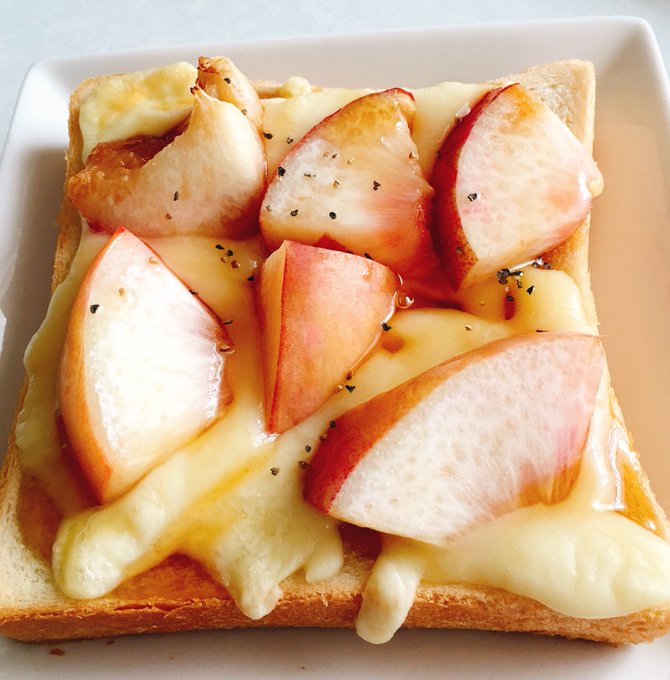 まじでこの厚切りパンにヒェ…ていうくらいバター塗り更にヤケのようにチーズをどさっとのせ、よく洗って切った桃を皮ごと切ってドカドカ並べてトースターでこんがり焼いたものに粗挽き胡椒ガリガリはちみつをトロリしたものは最高に美味しい罪のおやつだからみんなぜひ試してくれよな!