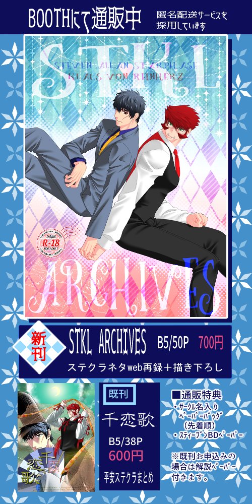 ステクラマルシェサークルカットとお品書き。 サークルカットはわかりやすく変更なし。 今回ブンさん誕なので青系でまとめてみたよ。 ブンさん誕ペーパーはBD当日(間に合えば)Twitterに上げる予定のものを印刷して同梱します。