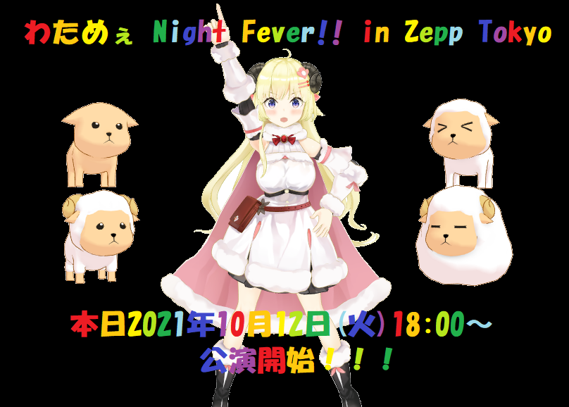 わためぇ Night Fever!! in Zepp Tokyo 本日2021年10月12日(火) JST18:00~ ここまで来たらもう後は楽しむだけ!!! わため&わためいとNo.1☝️🐏✨ お借りしたモデルはリプ欄にて #角巻わため #つのまきあーと #わたMMD #わためソロライブ ©2016 cover corp.