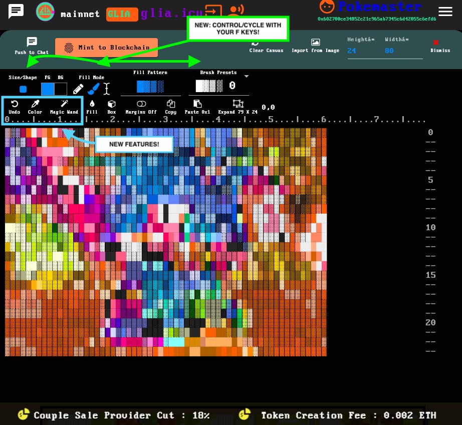 Worked on the editor today, added undo, eye dropper, magic wand and F-key quick toggle support. Must be logged in or use web3 to use editor. blockbra.in #ansiart #demoscene #pixelart