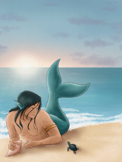 Week 2 of #mermaywaters beach! with a merman helping a little sea turtle #mermay #mermay2022 #Mermaid #merman #fantasyart