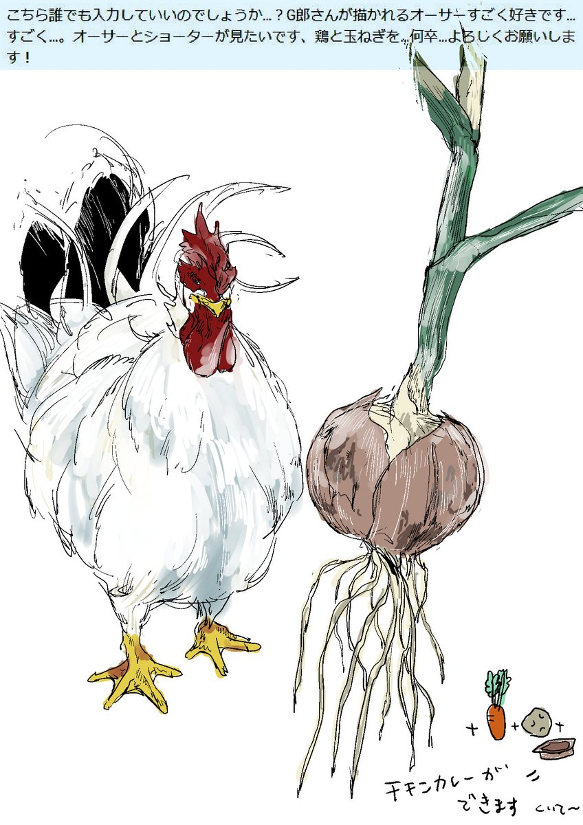 Q.こちら誰でも入力していいのでしょうか…?G郎さんが描かれるオーサーすごく好きです…すごく…。オーサーとショーターが見たいです、鶏と玉ねぎを…何卒…よろしくお願いします! A.