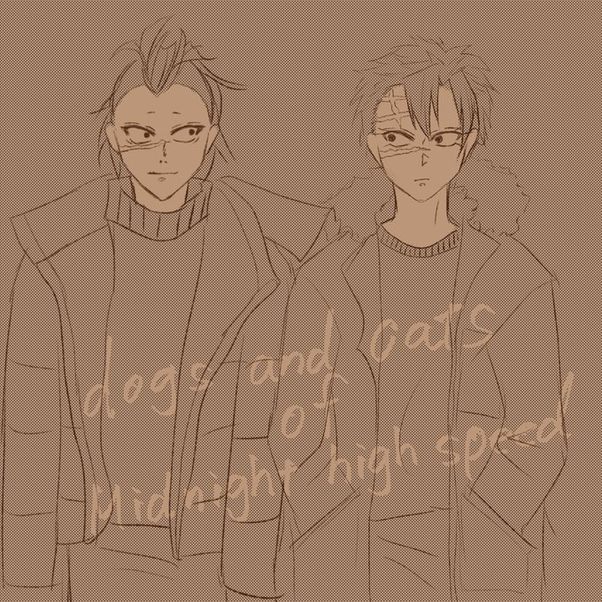 深夜高速の犬と猫 イメージイラスト描いてみました(自分で…) 🍃はモッズコート、🍉はちょっと寒がり設定でダウン 英訳合ってるのかしら🤔 twitter.com/gnyismyfave/st…