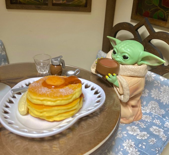 ごめん、カエルじゃなくて… パンケーキ美味しいから食べてみて マカロンいけるからパンケーキも大丈夫だよ、きっと #マンダロリアン #グローグー #オモ写