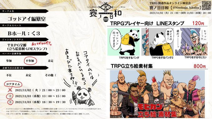 55 41 来週に迫りました、11/2・3(祝)のTRPG関連オンライン即売会「賽ノ目日和」出店します!!メインはLINEスタンプと立ち絵素材集だよ!遊びに来てね~!!! #さいのめお品書き #賽ノ目日和 21/10/30 17:31