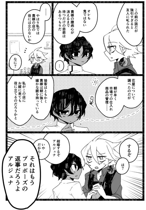 twitter.com/gog0309/status… だいぶ前に描いたワンドロの続きになる平和な現パロカルジュナ お花屋さんのお嫁さん可愛いなという気持ち