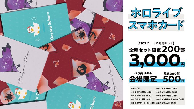 C102で頒布予定グッズ 「ホロライブスマホカード」 ホロスマホ背景をカードにしました! 100種のデザイン50枚のカード カードは遊戯王サイズです スマホケースに挟んだり、トークンで使える✨ *会場限定での販売あり #ホロライブスマホ背景