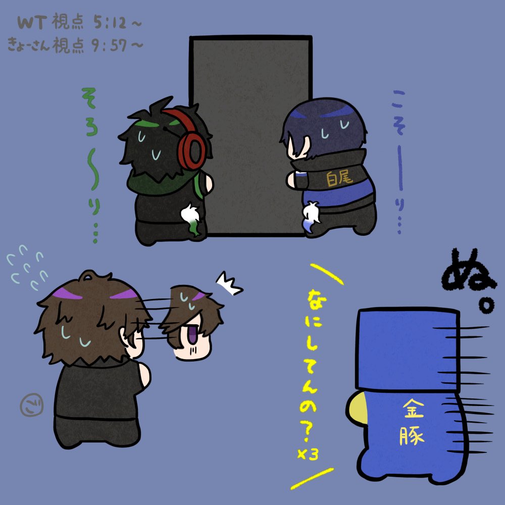 青箱コラボ好きなとこ〜 階段下をこそこそ伺う2人+後ろから様子を見てる1人+きょーさん #しろっぽ