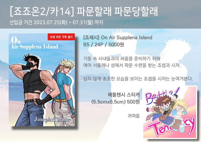 RT❤️[죠죠온/카14 파문할래 파문당할래] 죠세시 회지/스티커 현장수령을 위한 선입금 받습니다. (기간: 07.25~07.31 월요일 밤까지) 샘플 > posty.pe/mns381 선입금 > witchform.com/deposit_form.p…