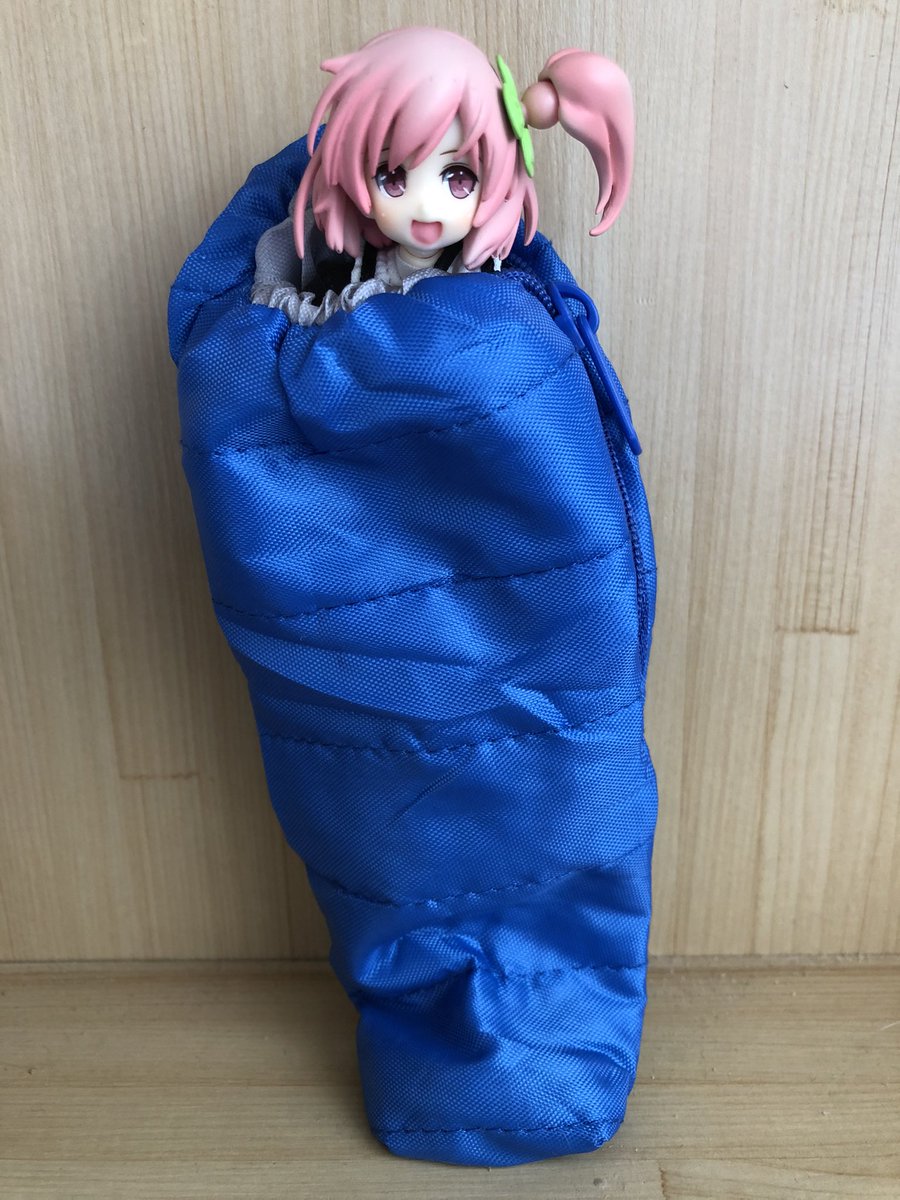 ガチャコーナーにあったシュラフを1回だけ回しました。1/12サイズのフィギュアが入るとのことなので早速梨璃を入れてみました。容量はしっかりあるので余裕で入ります🍀キャンプ系の小物を集めたら良さげかも #アサルトリリィドール部