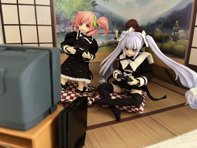 プレステ4のガチャガチャを見かけたので早速プレイしてもらいました(ブラウン管TVに接続できるかは置いといて) ミリアムはなんとなくあぐらかいてプレイしてそう。梨璃はレースゲームやったら身体ごと動くタイプ(ド偏見) #アサルトリリィドール部