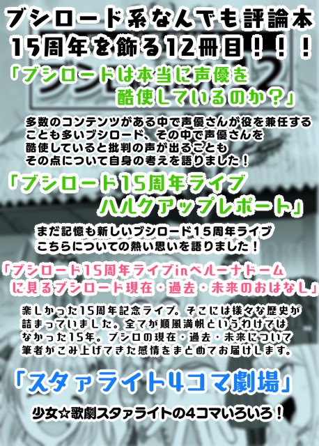 あなたのサークル「アンブレイカブルミルキィボム」は、コミックマーケット101で「土曜日東地区 "ヘ " 39b」に配置されました!コミケWebカタログにてサークル情報ページ公開中です! webcatalog.circle.ms/Perma/Circle/1… #C101WebCatalog ブシロのほん12では爆速で15周年ライブレポも入れようと思います!