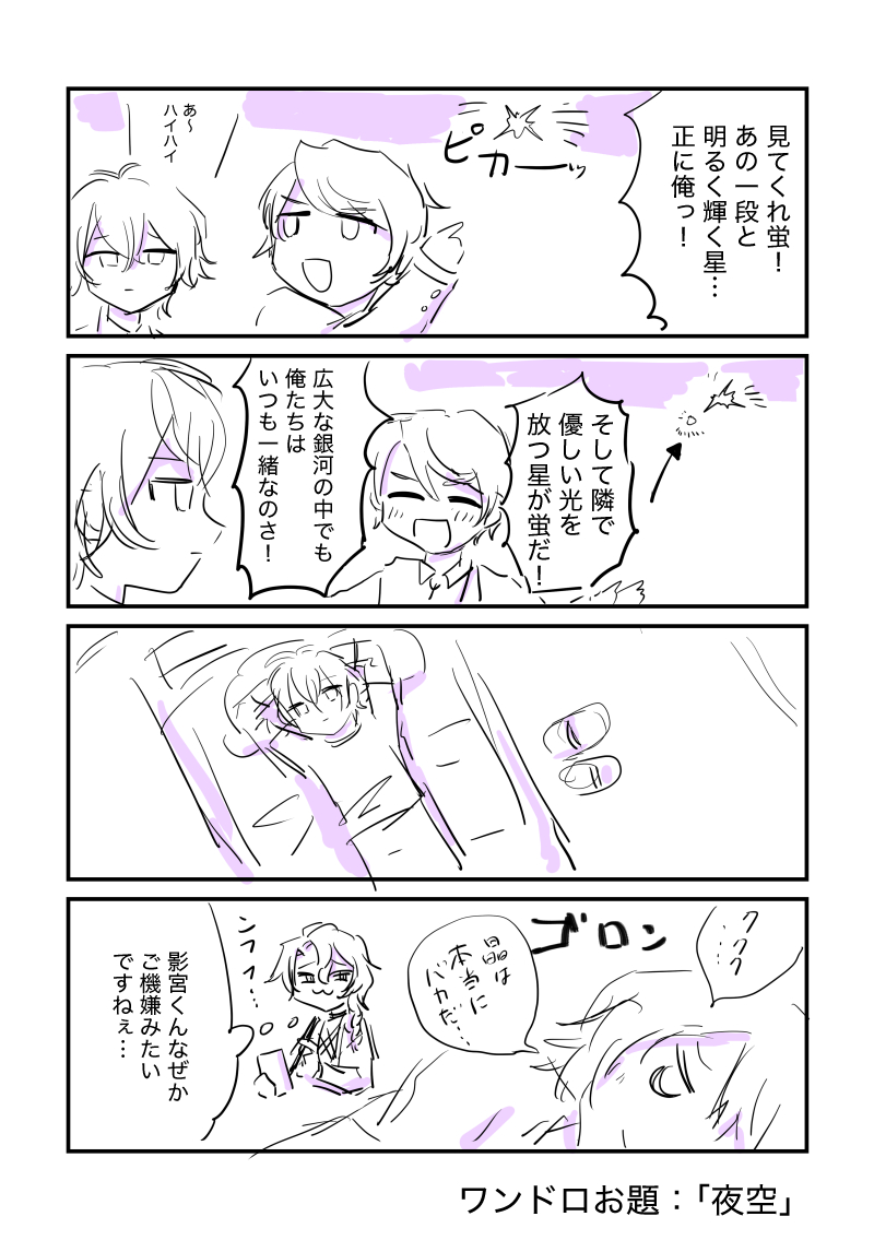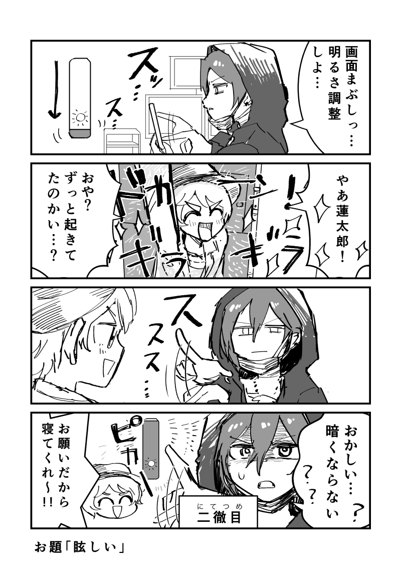 #ダンキラ版ワンドロライ お題「眩しい」+15min. ゲームで徹夜しがちな蓮太郎と同室って、人によってはストレスになりそうですが晶はそういうの一切気にしなさそうで良かったな…と思いながら描きました。