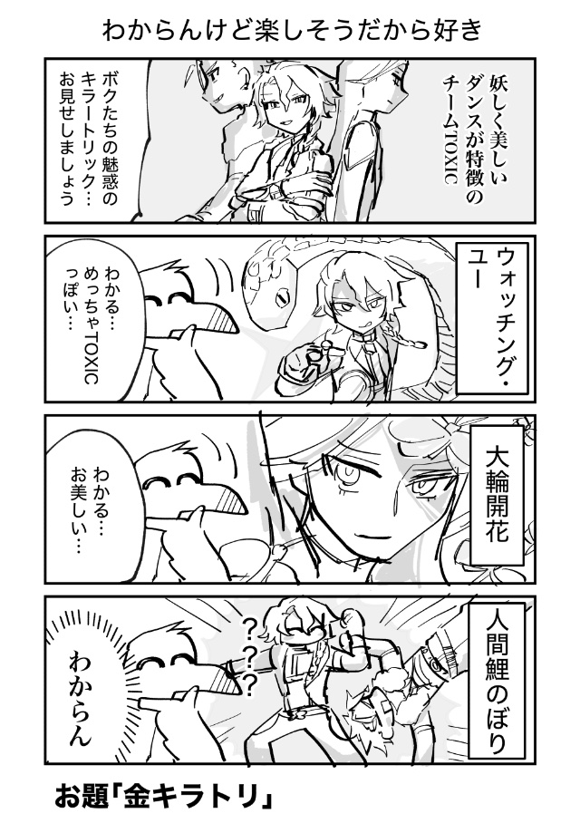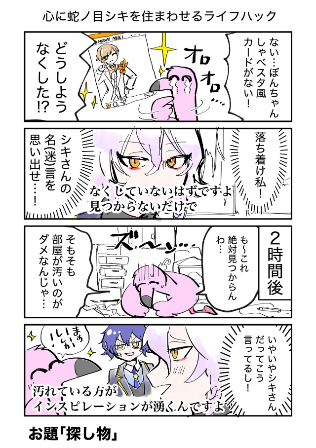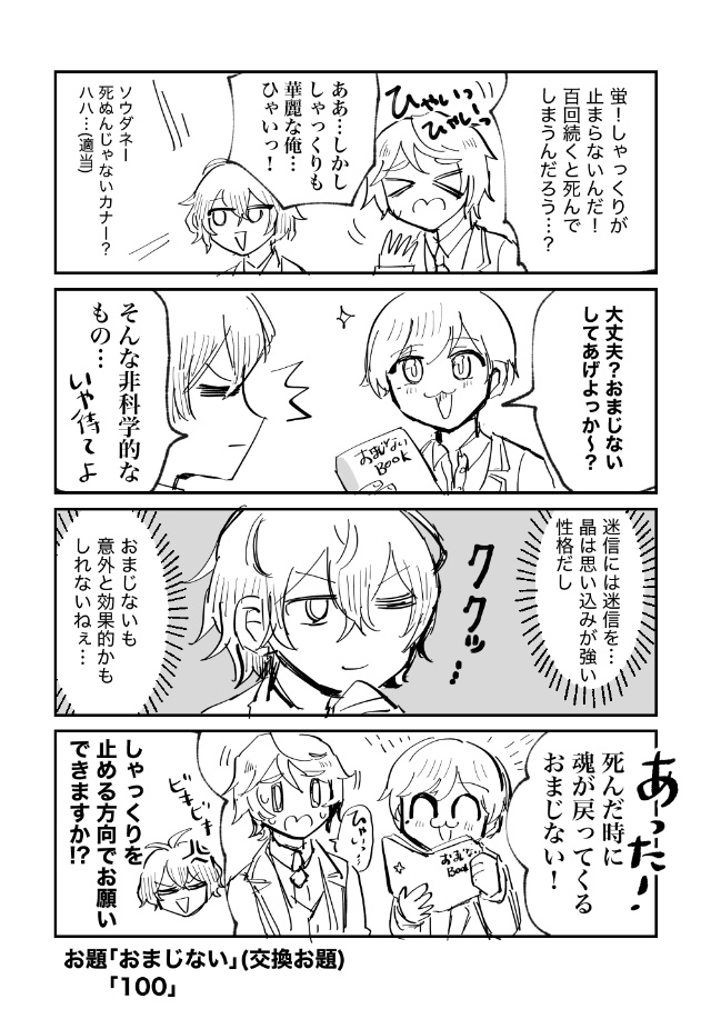 #ダンキラ版ワンドロライ お題「100」 交換お題「おまじない」 ワンドロ100回開催おめでとうございます!いつも運営ありがとうございます…! 「おまじない」というお題は四コマ描きには色々とネタが考えやすく、思わずガッツポーズ!でした。ちなみに私が出したお題は「フラミンゴ」です
