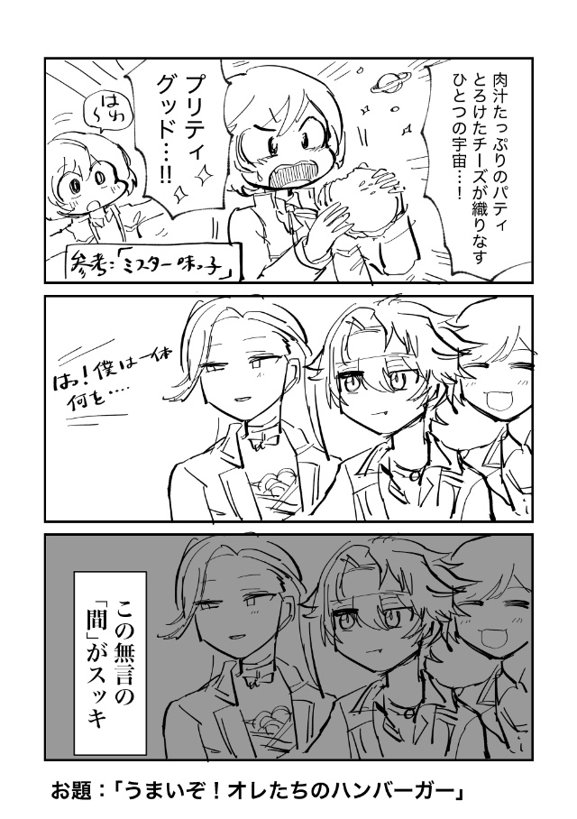 #ダンキラ版ワンドロライ お題【うまいぞ!オレたちのハンバーガー】 ネタはイベストcount4より ダンキラは「間で語る」のが異様に上手いゲームだと思います。ギンコさんと賢人のソウルリンクスト「練習に夢中」の無言ギンコさんとか、たまらなく良い