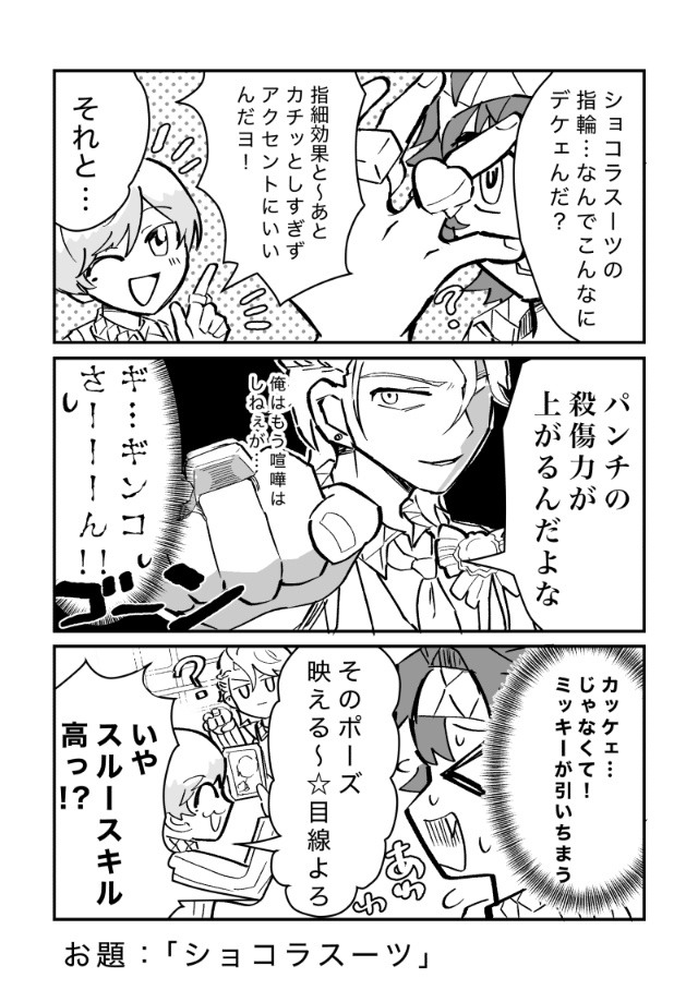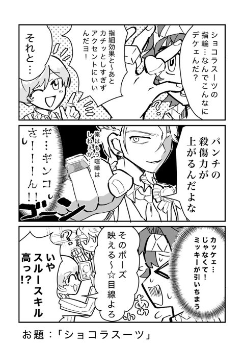 #ダンキラ版ワンドロライ 3月11日開催分 お題「ショコラスーツ」+15min. 遅刻参加です! ミッキーは繊細で気遣いのできる男ですが、ギンコさんに対しては割と肝が太い対応をしそうに思います。