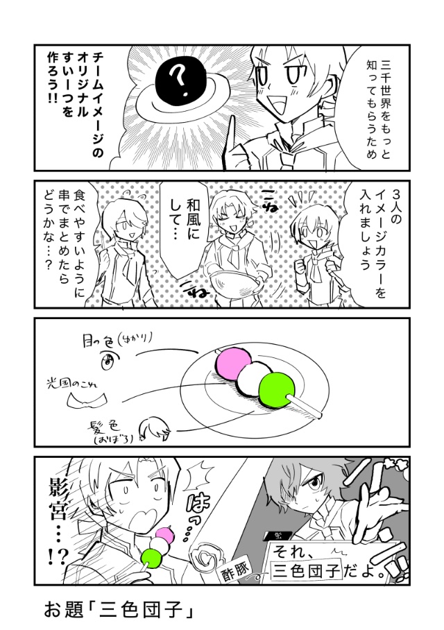 #ダンキラ版ワンドロライ お題「三色団子」 マンガと関係ない余談ですが、パティシエウォーズの組み分けで、光国と真っ先に組もうとする(=目ざとい)メンツが晶とまひるちゃんなの、なんか良いですよね…。 久しぶりに制作時間を60分に収められました。