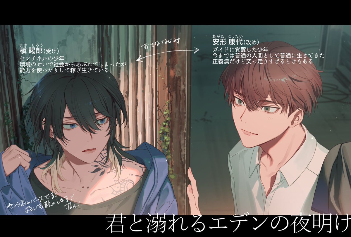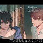 本日5/15発売のBL漫画『君と溺れるエデンの夜明け』に登場する主役のお二人、康代とシロを紹介するPOPなんかもご用意させていただいたりしちゃっておりましてよければご覧ください #君と溺れるエデンの夜明け