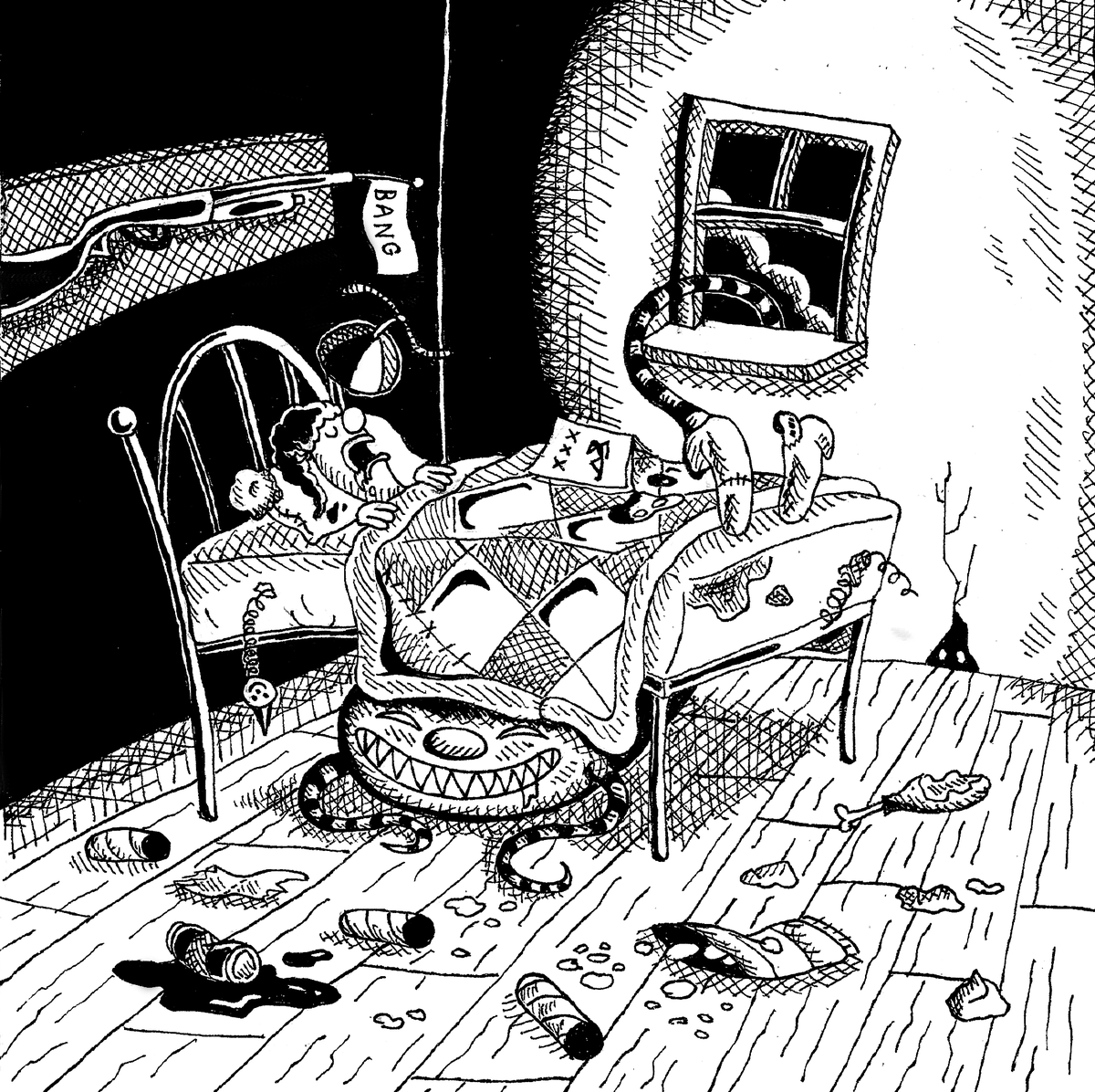 Inktober 2020 Day 19: Dizzy. Time to drink the bad opinion juice and fall down. #dizzy #inktober2020 #blackandwhite #penandink #traditionalart #crosshatching #clown #patchwork #filthy #beercans #alcohol #drunk