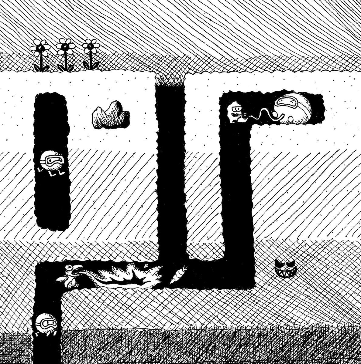 Inktober 2020 Day 24: Dig......Dug #dig #digdug #rock #soil #dirt #pump #pop #hole #carrot #underground #namco #arcade #inktober #pooka #fygar #traditionalart #penandink #crosshatching #blackandwhite