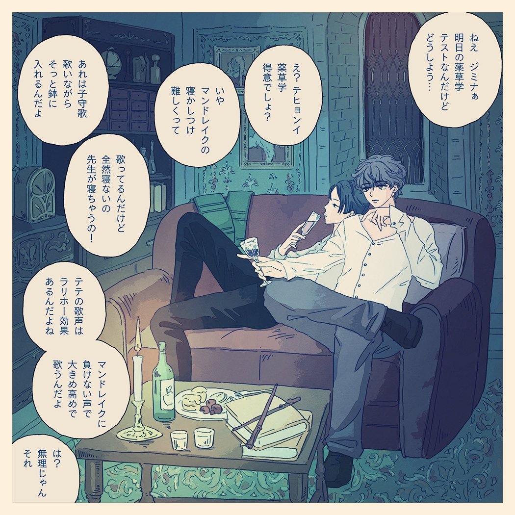 55 1053 ホグワーツのスリザリン寮でまったり過ごすクオズ。 #jimin #taehyung #vmin #btsfanart 23/05/20 11:44