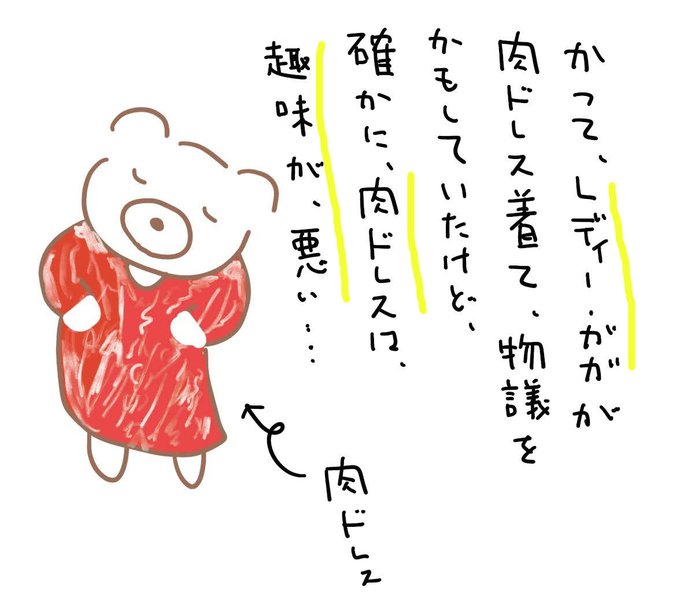 お肉が食べたい~と思いながら、 絵を描いていたら、いつのまにか かわいいクマに肉ドレスを着せていました。 それにしても肉ドレスは、 どんなキャラが着ても趣味が悪いな・・・と🤓 あらためて、です #イラスト好きさんと繋がりたい #イラスト