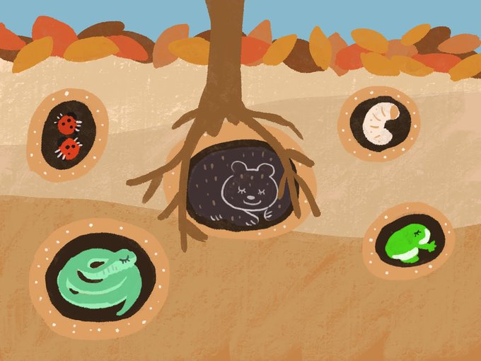 みんな今頃は、地中の生活をエンジョイしているのかな? 春夏はしっかりお外で遊んで、秋は冬眠前の食糧を集めて、冬は地中でスヤスヤ。 冬眠って、サイドファイヤーみたいだわ #イラスト #イラスト好きと繋がりたい