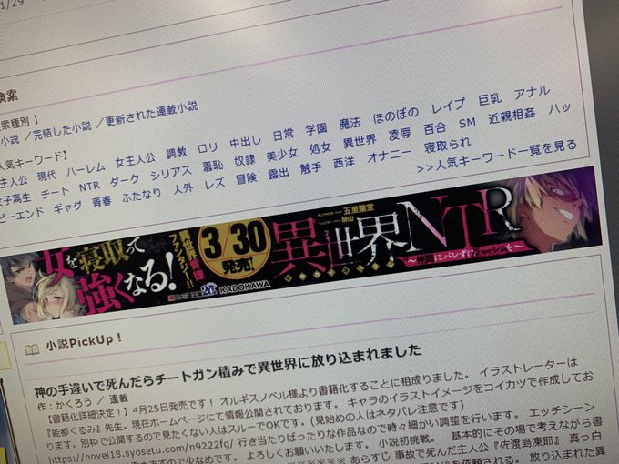 ノクターンノベルズのTOP画面に異世界NTRのバナー広告が表示されるようになりました!! なんかいろんな属性の単語が並んでるすぐ下に置かれるとエロ落書きされてる気分になりますね!