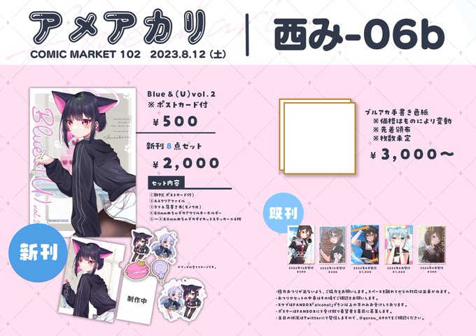 🎐C102お品書き(ver.2)🐈 8月12日(土) 西み-06b #C102 表紙やグッズはカズサレイサ多めですが、 新刊の中身のキャラは色々です! グッズ等の写真はツリーに順次公開予定! 当日はよろしくお願いします!! Webカタログ:webcatalog-free.circle.ms/Circle/17306090