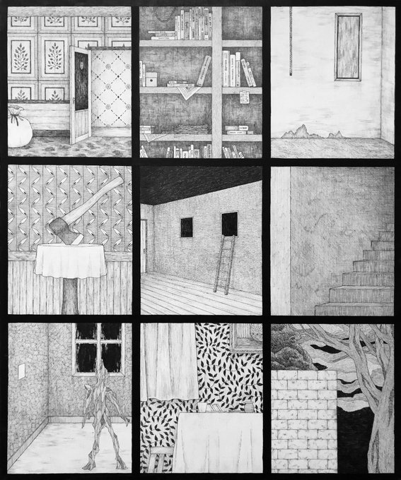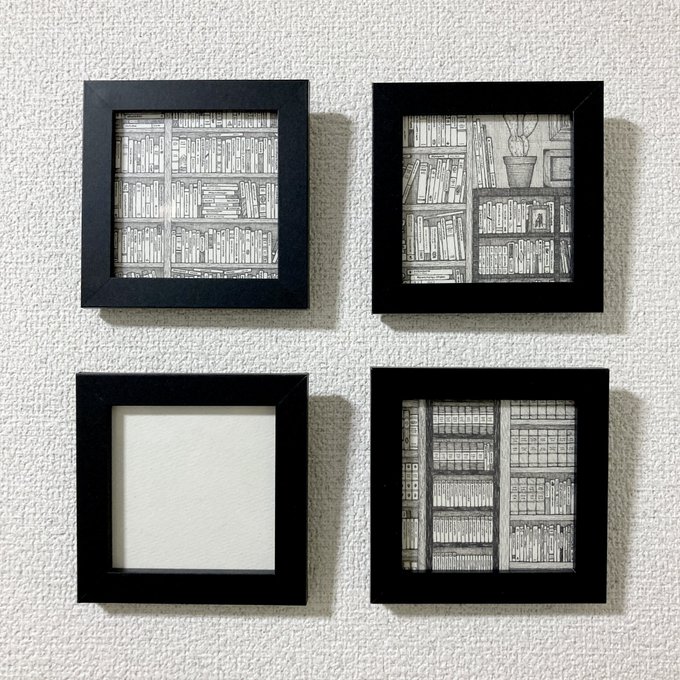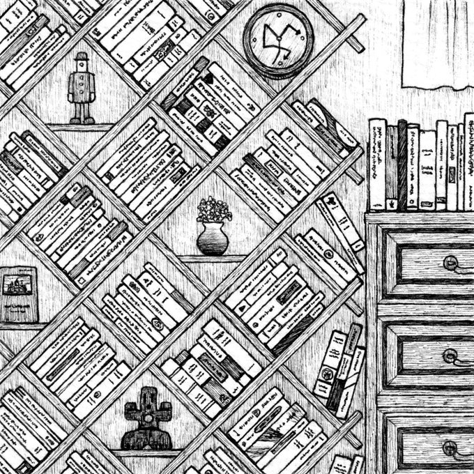 「どこのだれかの本棚」。 どう個性を出すかが悩ましい。 #線画 #ペン画