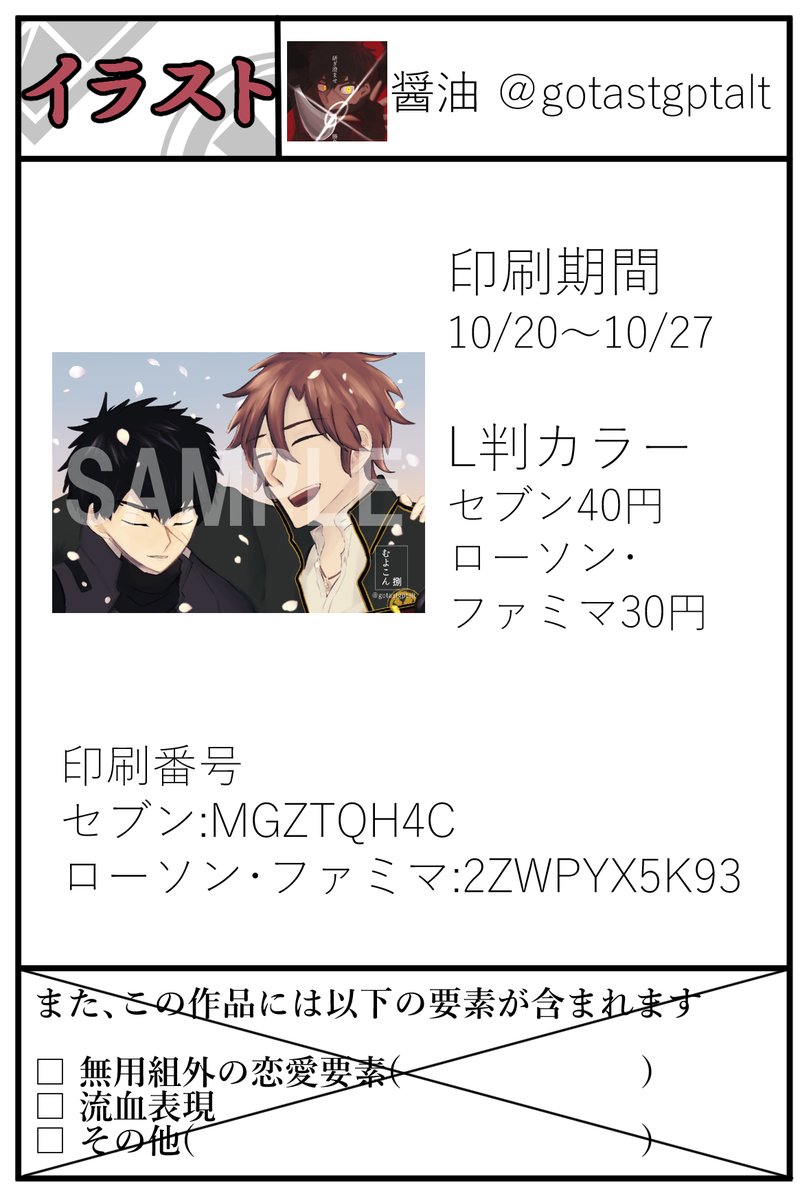 21 24 #むよこん捌 開催おめでとうございます! イラストでの投稿となります! どうかよろしくお願いいたします! L版/カラー 印刷期間:~10/27 そして主催様、いままでお疲れさまでした&ありがとうございました! 毎回とても楽しい催しでした! 22/10/20 19:52