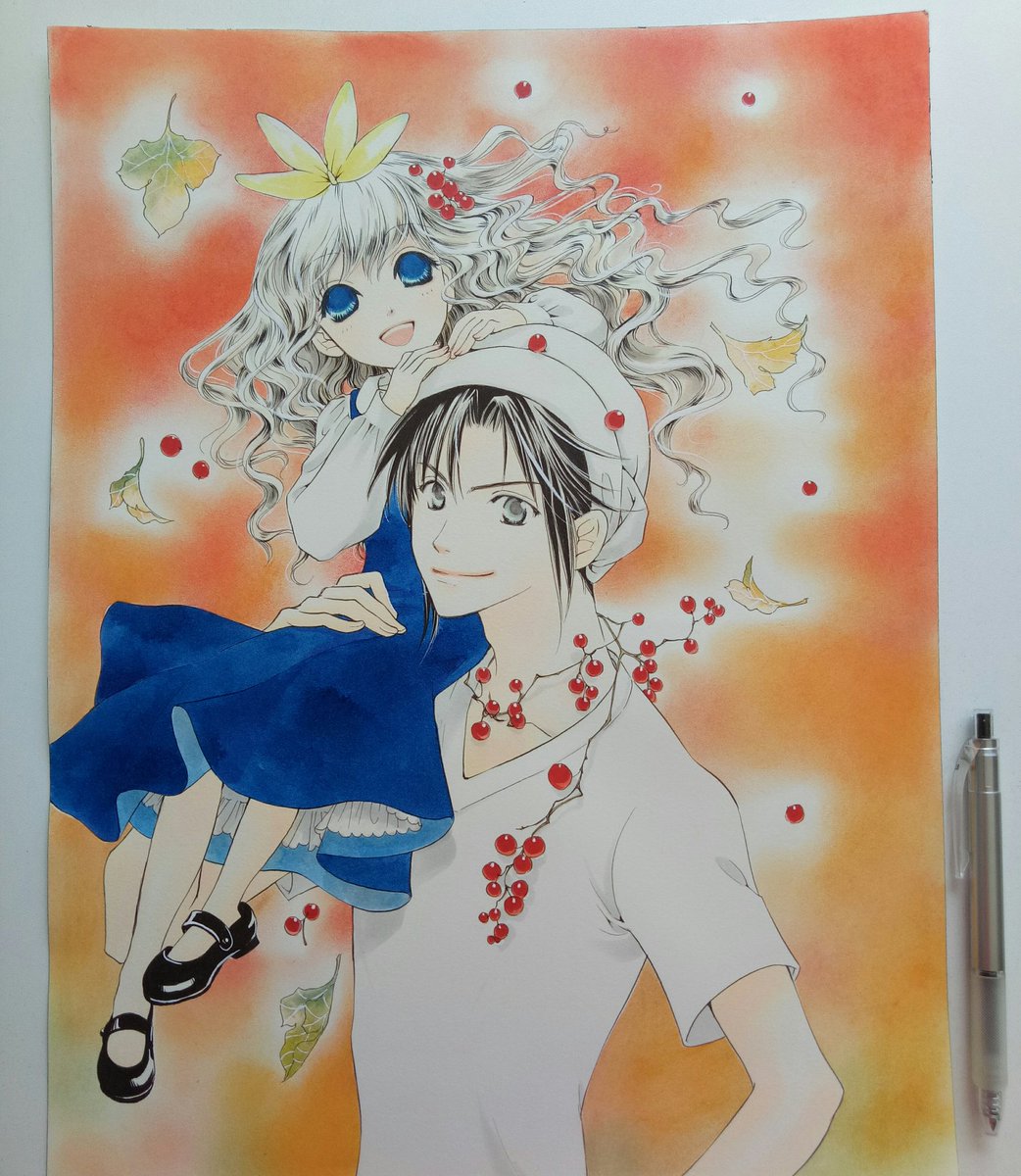 14 84 ちょっと前のらくがき、途中ですが。 『花のように』という各話読み切り(小説ウィングス掲載)で描いた作品のギン(銀杏の種)と透子です。 植物の種と人間の関りを描いたシリーズでした。とても気に入ってます😊 22/06/16 20:59