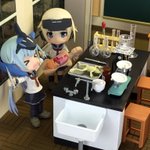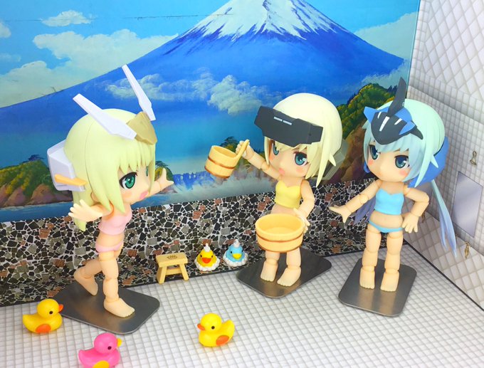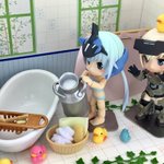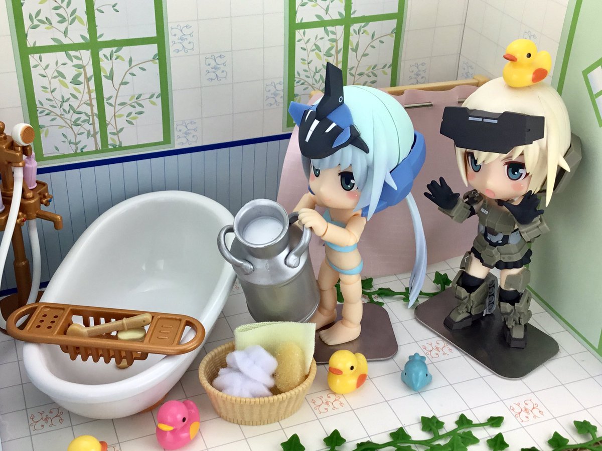 #夜のフィギュア撮影会 #キューポッシュ #フレームアームズ・ガール #FAガール 【7/13お題 『計画』】【既出】 「ちょっと、何してんですか、スティレット⁉️」 「何って、牛乳風呂でお肌をすべすべにする計画よ🎶アンタも後で入る?」