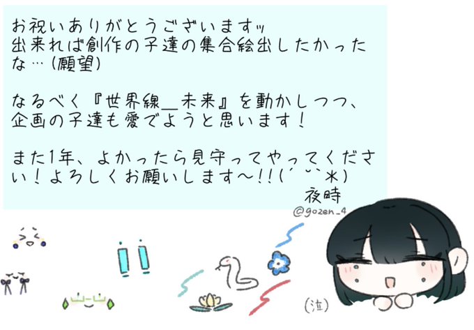 まさかお祝いしてもらえると思ってなかったから……ね クオリティは許して……(◜ᴗ◝ ) ちなみに描いてあるモチーフ(?)のキャラが全員分かったら凄いです👏👏 #世界線_外伝 #イラスト #絵描きさんと繋がりたい
