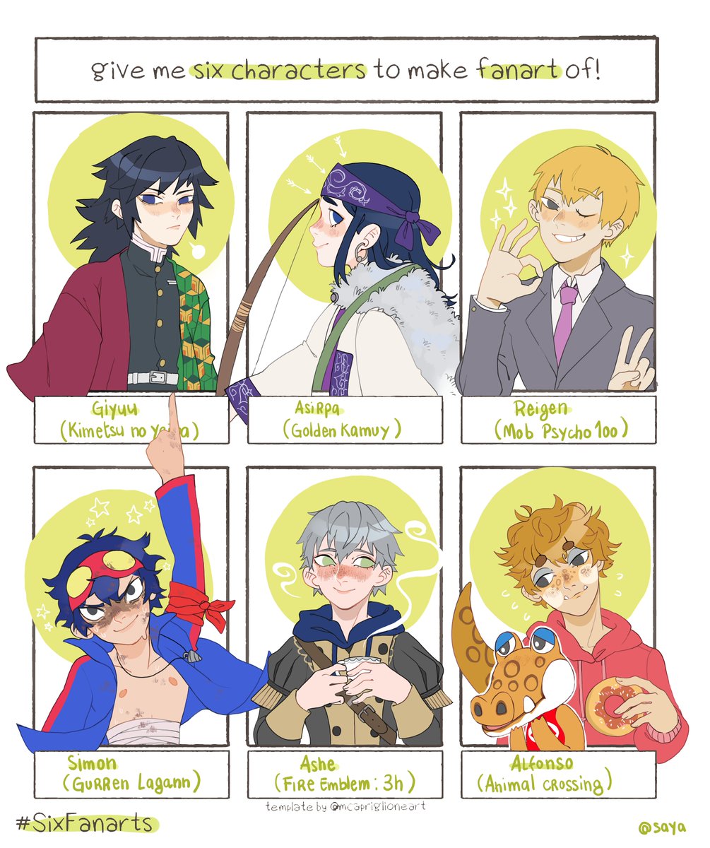 hhhhh finished the #SixFanarts challenge. what a bunch of good chara,,,,, the real challenge was actually to choose only six of them,,,,,