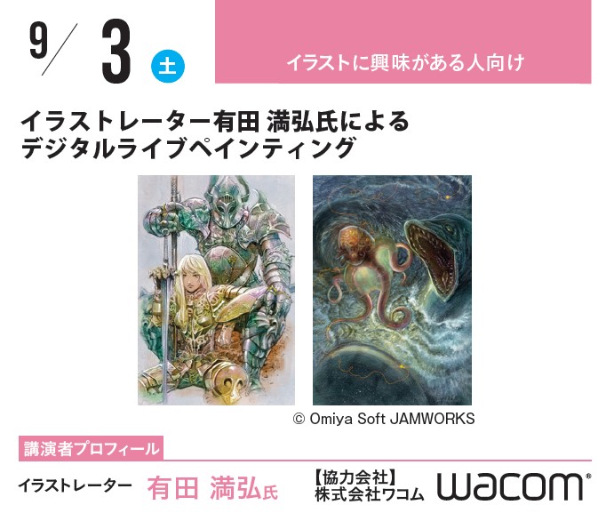 2 7 おはようございます。 本日はついに、有田満弘氏によるデジタルライブペインティングです! 13:30~会場への移動開始となっております。 受付もしないといけないので、13:00~13:20くらいにお越しいただけると、スムーズです。 では、お待ちしておりますね! #有田満弘氏 #イラスト #超貴重 #実演 22/09/03 08:04
