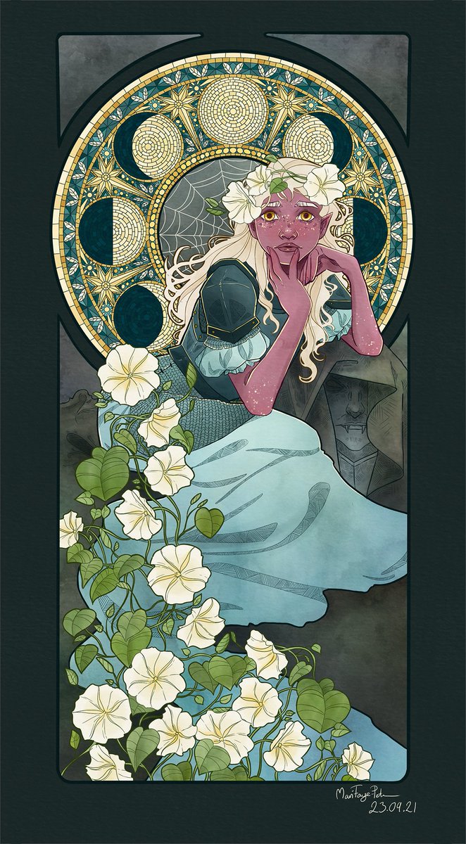 Imry Summerborn, a young aasimar cleric, dedicated to Eilistraee Heavily inspired by Alphonse Muchas artwork "Topaz" #art #artnouveau #dnd5e #dnd #dndart #dungeonsanddragons #artist