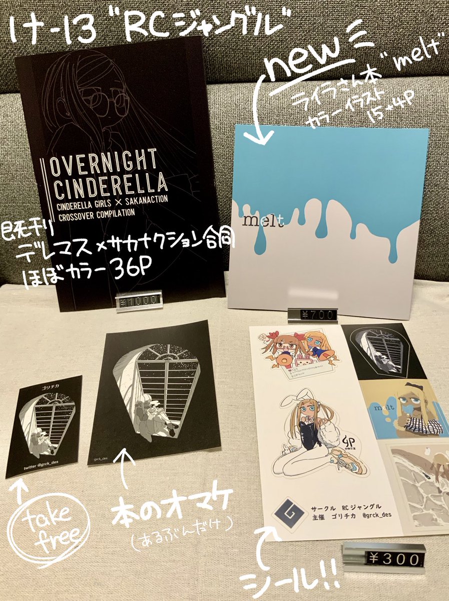 シンステお品書き別途出すけどとりあえず、、、! 新刊:『melt』ライラさんイラスト本 B5変形(正方形)カラー 本文15P+寄稿4名計4P 700円 既刊:『OVERNIGHT CINDERELLA』 デレマス×サカナクション合同 B5カラー本文36P 1,000円 ほか:シールA5マルチ(シールは5枚) 300円 あとは大昔の既刊