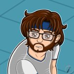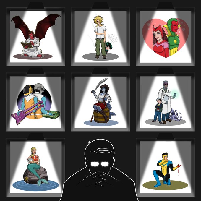 This year's #artvsartist2021 challenge, but with my avatar sitting in the dark in the Gendo pose in front of my #gallery. #digitalart #drawings #fanart #artchallenge #artvsartist #mha #wandavision #daftpunk #residentalien #mermaid #invincible #thegendopose #grdilicious #grdi